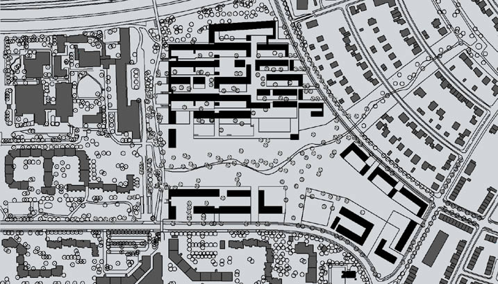 The competition focuses one of the last large undeveloped real estate sites in Munich. Around an open green space, the scheme proposes dwellings with facilities such as a welfare centre, shops and offices. Located next to a busy highway, the site required specific solutions to deal with the traffic noise.