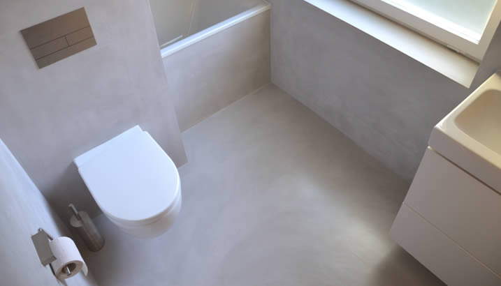 Positioned, at a right-angle in the room, is an installation wall that allows the fitting of a modern wall hanging WC without visible connections. At the same time this wall separates the shower area from the bathroom. The jointless covering of the floor and walls is achieved using a mineral plastering technique with a velvety surface.