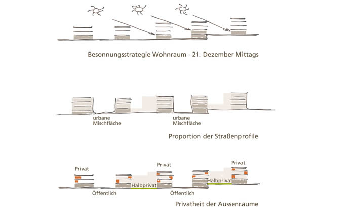 Instead of multigenerational and old people’s housing, the mix is provided across the whole quarter. The mix of different housing typologies paired with social assistance services permits those in need a life in an integrated, mixed social environment. Manageably sized neighbourhoods share common outdoor spaces (courtyards).