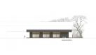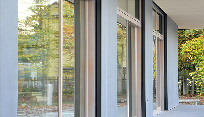 The building is of a hybrid construction with prefabricated timber flat roof elements placed on solid walls. Inside, light coloured render combined with spruce ceilings and paneling and oak doors and window frames characterize the palette of materials. The acoustic timber fins also give the room a visually comfortable atmosphere. The floor’s consistent hue visually connects the brown linoleum floor inside to the brown precast concrete elements of the covered terrace. The anthracite coloured textile reinforced concrete façade panels reach up high to the projecting fascia of the cantilevered roof.