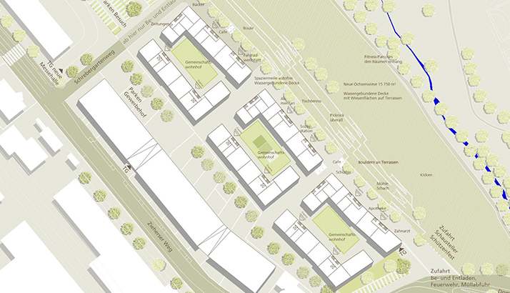 The green space will be enclosed and transformed into an urban outdoor space. With the new Ochsenwiese, the new neighbourhood will have a green centre. Apart from being used for traditional fairs such as the Schützenfest, the area will serve as a centre of attraction for all citizens throughout the year.