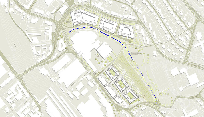 The relocation of the Ochsenwiese to the heart of the neighbourhood transforms the current parking area into an urban space. In the middle of the new quarter, a generous, protected green space is created: The new space as a multifunctional urban recreation area, the retention basin as a piece of unspoilt nature.