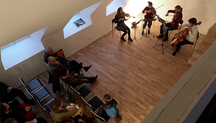 Das zweigeschossige Wohnzimmer der Maisonette diente als kleiner "Konzertsaal" und beindruckte mit einer unerwartet guten Akustik. Musikalische Highlights waren „Ridge Walk" mit Eigenkompositionen in Zweierformation (Gitarre-Gesang) und das Klavier-Geigen Duo Esther Lingath und Andreas Winkler mit ihren „Saitenklängen zwischen Paris und Bagdad."