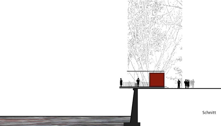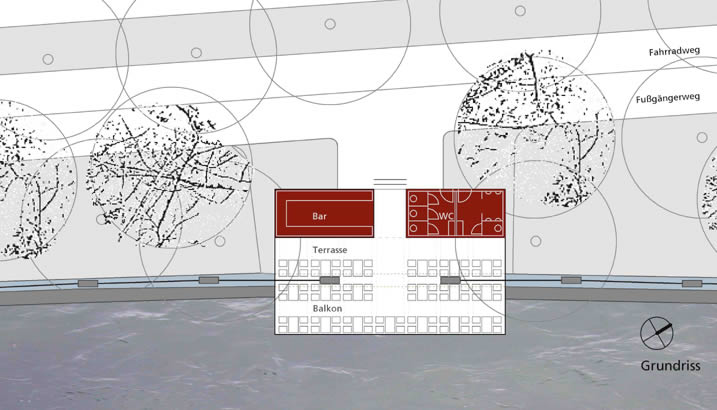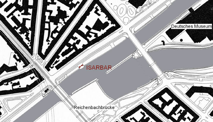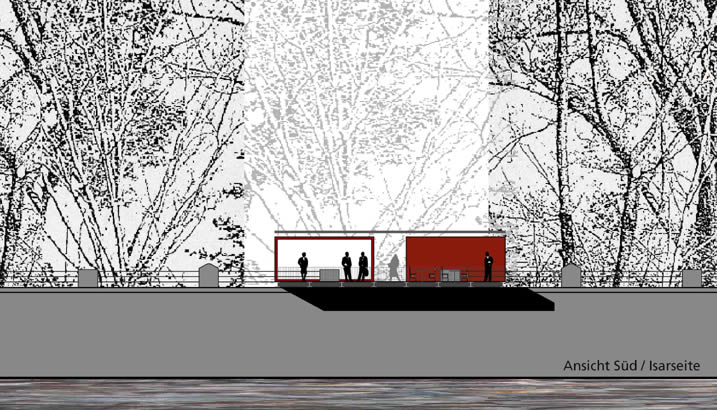 Die Isarbar bietet Erfrischung und Erholung, Essen und Trinken erstmalig an zentraler Stelle direkt über der Isar an. An einer vorhandenen Baumlücke im dichten Bewuchs der Erhardtstraße kragt eine Plattform aus Stahlträgern (ohne Verankerung) über die Ufermauer aus und ragt wie ein Balkon über die Isar. Das Gegengewicht bilden eine Box für Essens- und Getränkeausgabe, eine Sanitärbox, sowie zusätzlicher Ballast.