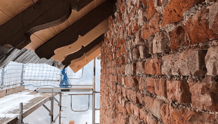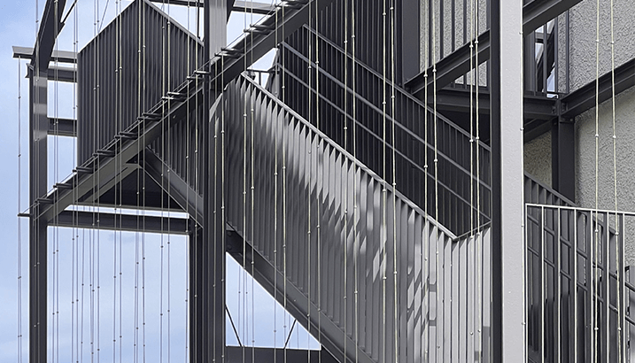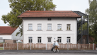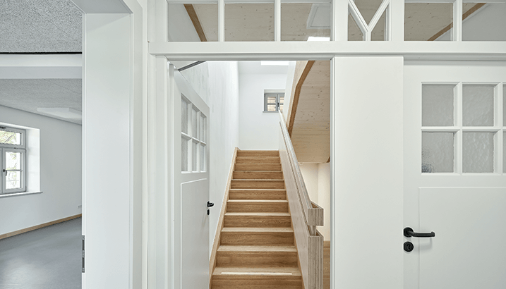 Möglichst viele Bauteile des Bestands wurden erhalten bzw. wiederverwendet. Während die Fassade des Bestands nach historischen Zeichnungen rekonstruiert wurde, schliesst das neue Fluchttreppenhaus als moderner Stahlbau an. Als Verlängerung des Gebäudeprofils ordnet er sich einerseits dem Bestandsgebäude unter, setzt aber andererseits einen modernen Akzent neben dem denkmalgeschützten Bestand. Mit seiner Berankung mit Hopfen und wildem Wein wird der Stahlbau im Laufe der Zeit immer mehr zu einer grünen Verlängerung der Kubatur.